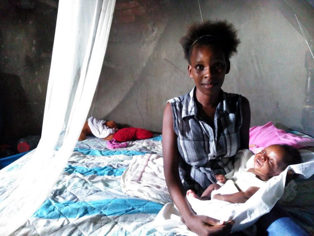 Elisa con su bebé bajo el viejo mosquitero que sustituirá con la nueva red tratada con insecticida. Cuando estaba embarazada, Elisa aprendió sobre la importancia de dormir bajo redes tratadas con insecticida gracias al personal del puesto de salud cercano a su casa.